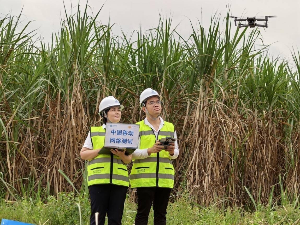 移动工作人员用5G+无人机巡查蔗林网络覆盖情况。赖雪芳摄